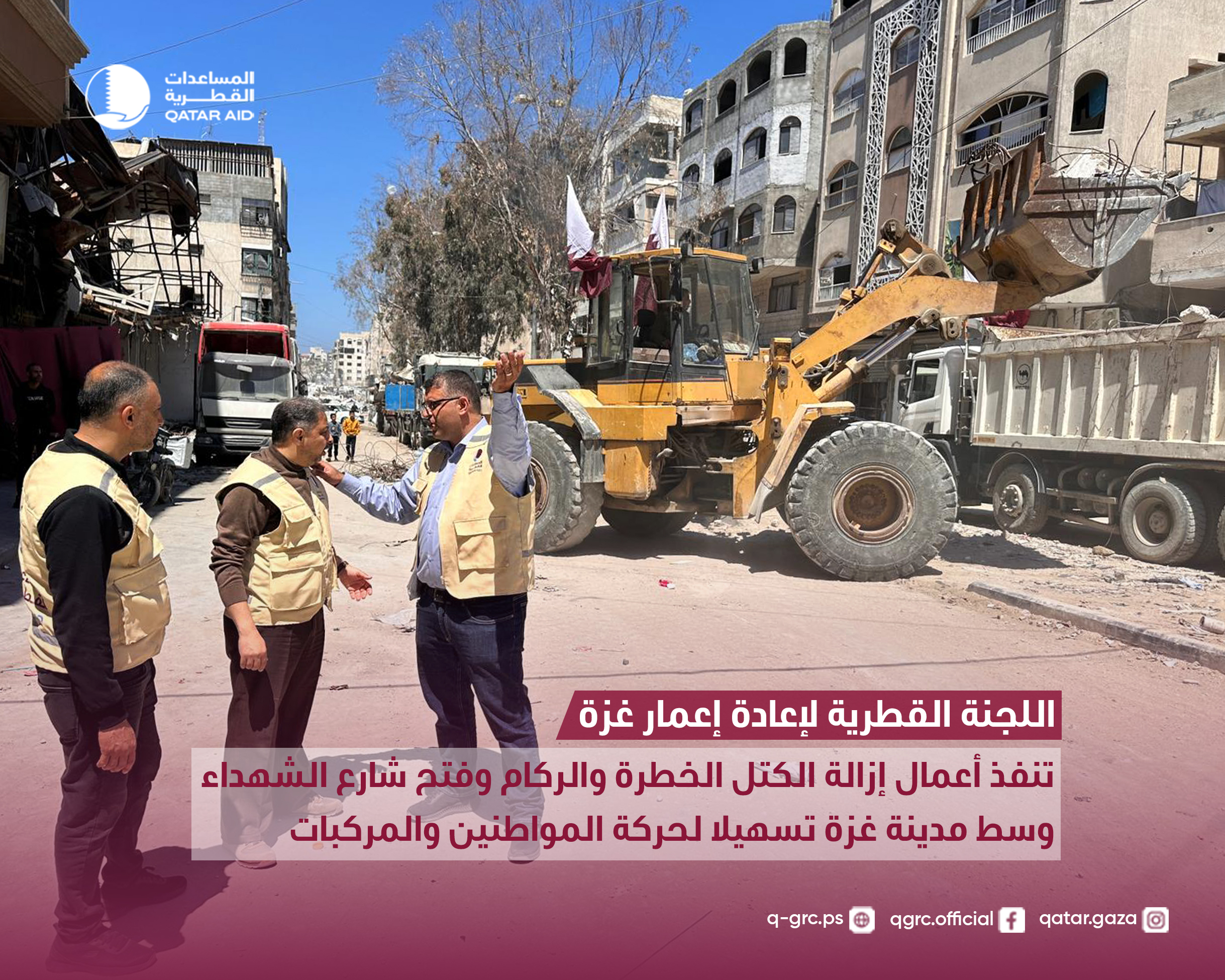 شرعت اللجنة القطرية لإعادة إعمار غزة في تنفيذ أعمال إزالة الكتل الخرسانية الخطرة وإزالة الركام لفتح شارع الشهداء وسط مدينة غزة، تسهيلاً لحركة المواطنين وتنقل المركبات وتعزيزا للسلامة العامة للسكان.